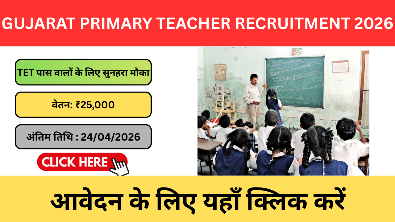अगर आप गुजरात में सरकारी शिक्षक बनने का सपना देख रहे हैं, तो आपके लिए बड़ी खुशखबरी है। Gujarat Primary Teacher Recruitment 2026 के तहत लगभग 11,000 पदों पर भर्ती निकाली गई है। यह हाल के वर्षों की सबसे बड़ी शिक्षक भर्ती मानी जा रही है, जिससे हजारों युवाओं को रोजगार का मौका मिलेगा।